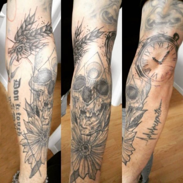男生手臂上黑灰点刺植物花朵和骷髅纹身图片