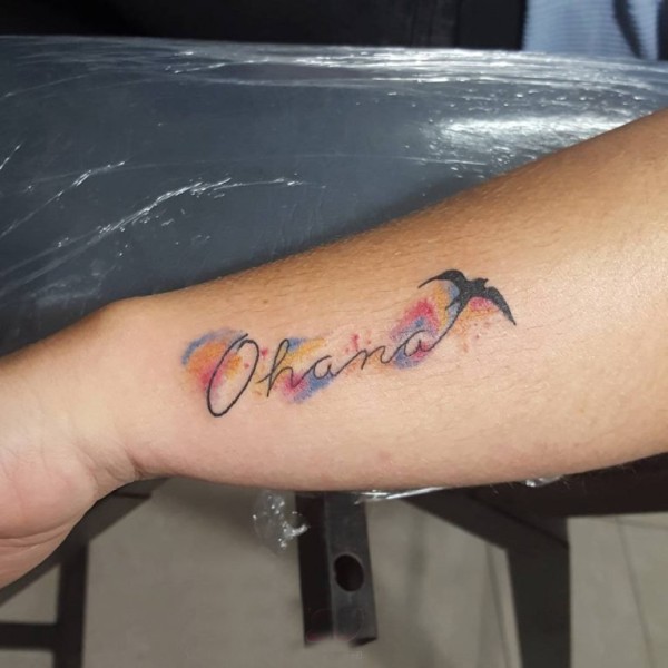 男生手臂上彩绘泼墨简单线条英文单词和小鸟纹身图片