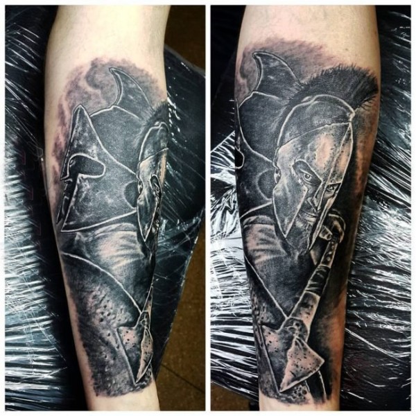 男生手臂上黑灰素描点刺技巧创意斯巴达战士纹身图片