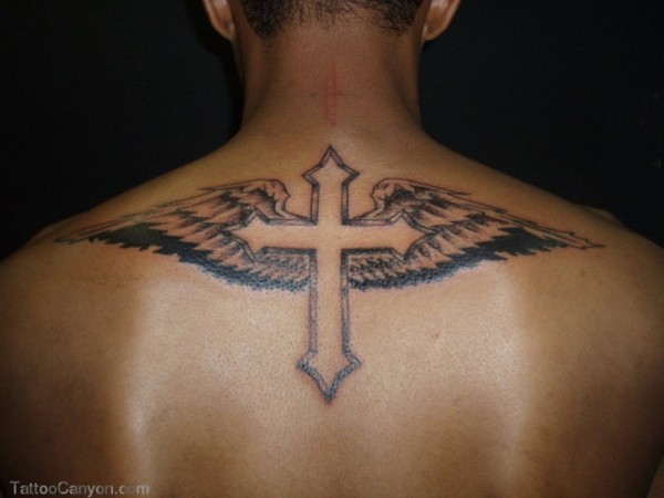 男生背部黑灰素描创意十字架和翅膀纹身图片