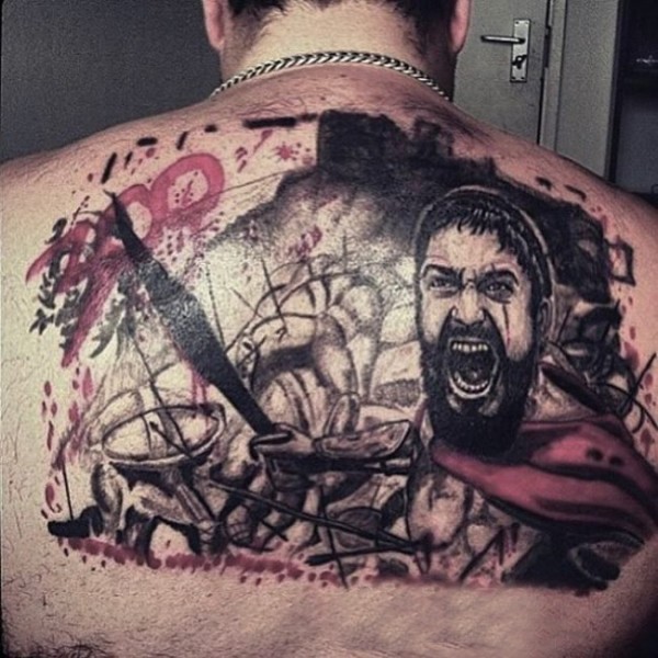 男生背部黑灰素描点刺技巧创意战士纹身图片