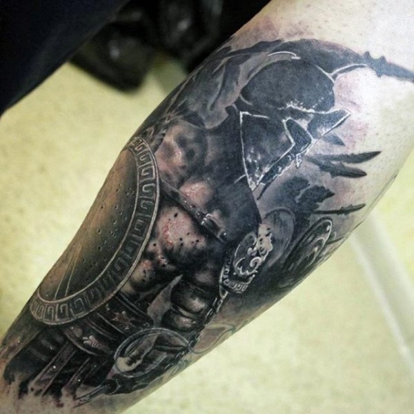 男生小腿上黑灰点刺人物肖像武士纹身图片
