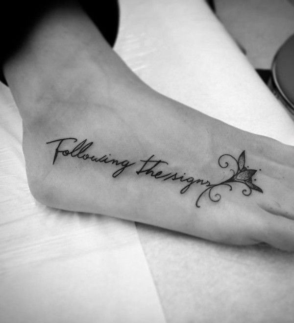 女生脚背上黑色抽象线条英文和文艺花朵纹身图片