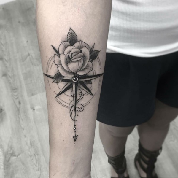 女生手臂上黑色点刺指南针和植物文艺花朵纹身图片