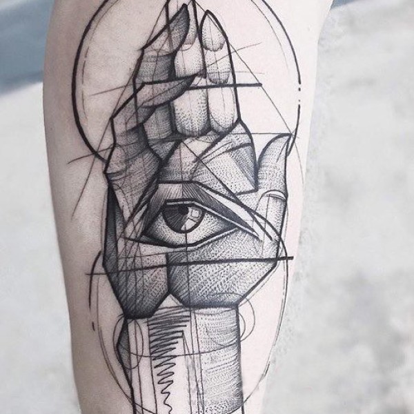 男生手臂上黑色素描抽象线条眼睛和手部纹身图片