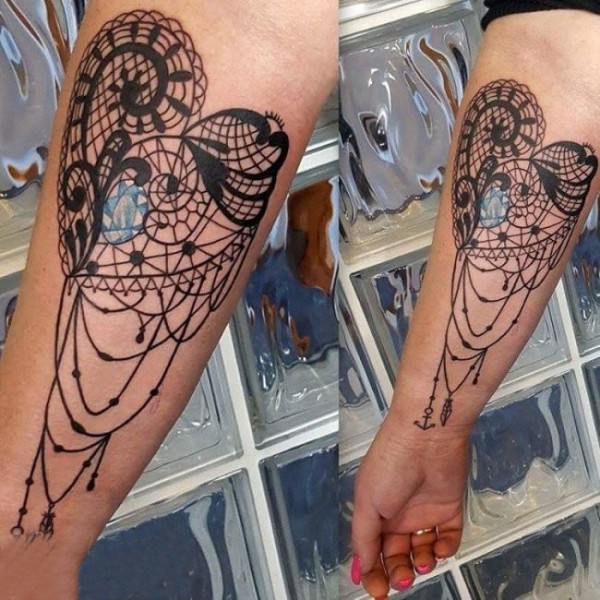 女生手臂上黑色线条素描唯美蕾丝元素心形纹身图片
