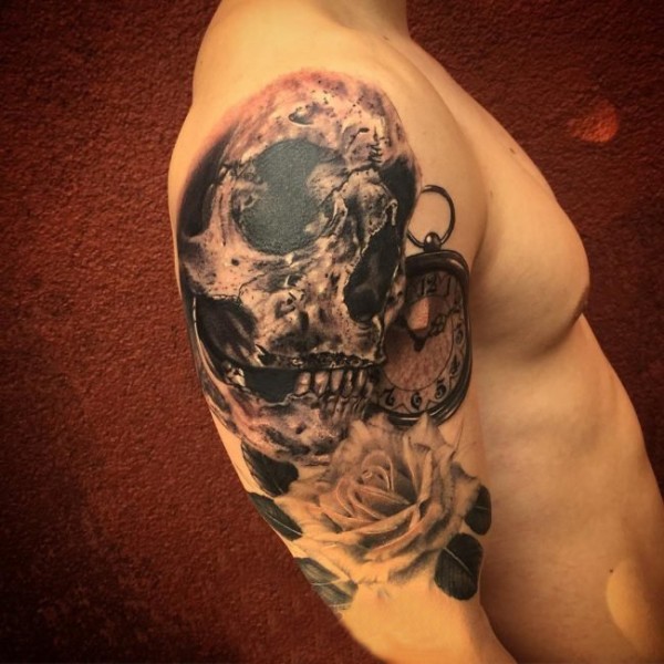 男人大臂黑白彼岸花骷髅_黑白纹身图案大全_纹身图吧