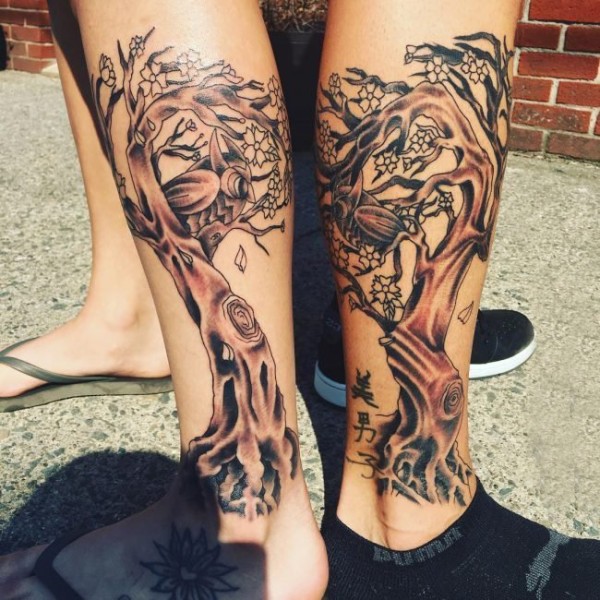 情侣小腿上黑灰素描点刺技巧创意生命树纹身图片