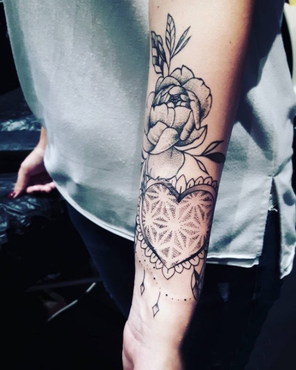 女生手臂上黑灰素描创意心形和花朵纹身图片