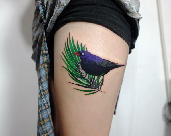 女生大腿上彩绘植物叶子和小动物鸟纹身图片