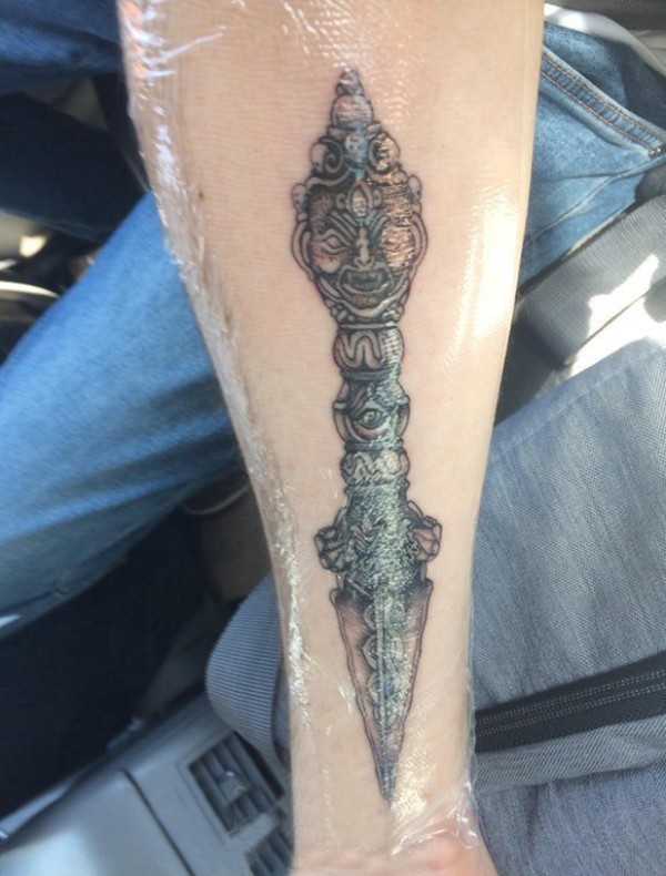 男生手臂上黑色点刺几何线条玛雅图腾纹身图片