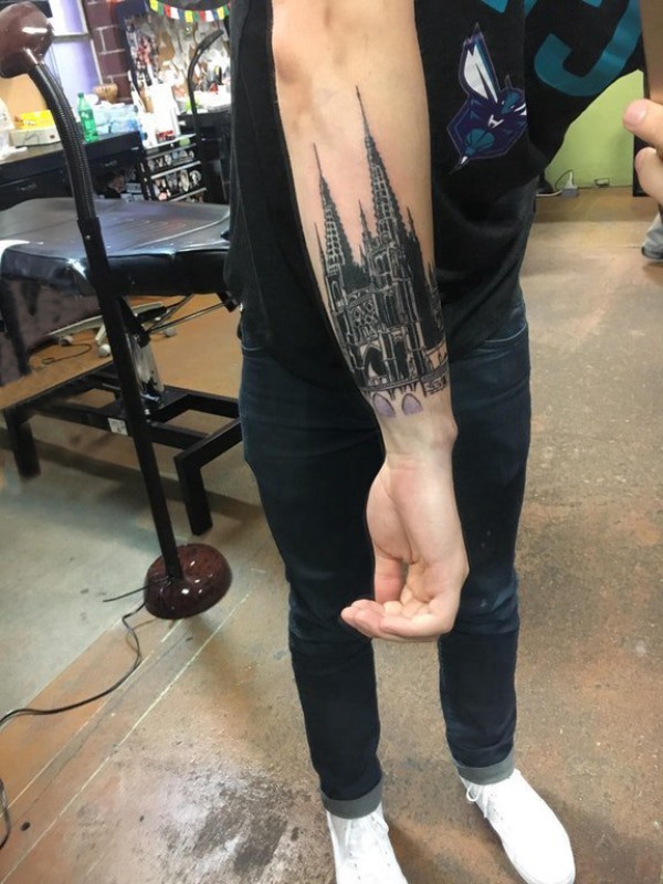 男生手臂上黑色点刺立体几何线条建筑物纹身图片