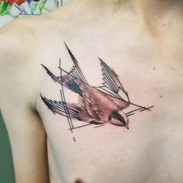 男生胸部黑灰点刺几何线条三角形和小鸟纹身图片