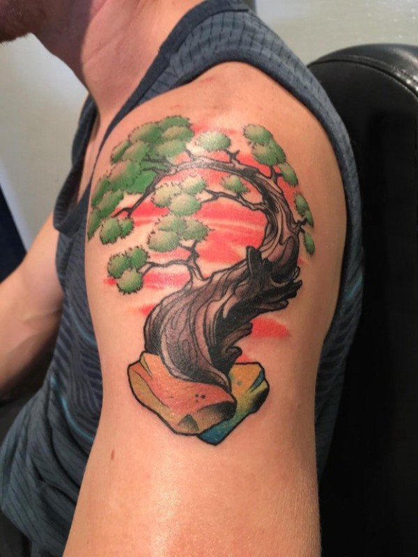 男生手臂上彩绘渐变植物素材大树纹身图片