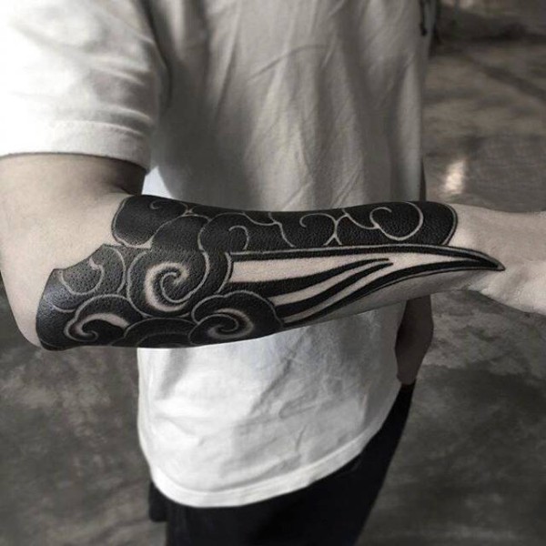 男生手臂上黑灰素描创意腾云花臂纹身图片