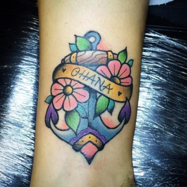 女生小腿上彩绘植物花朵和船锚纹身图片