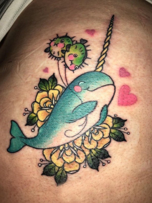 男生肩部彩绘简单线条植物花朵和鲸鱼纹身图片