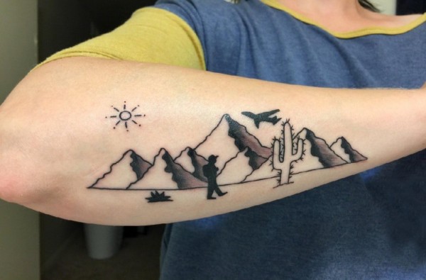 男生手臂上黑灰点刺抽象线条人物和山脉风景纹身图片