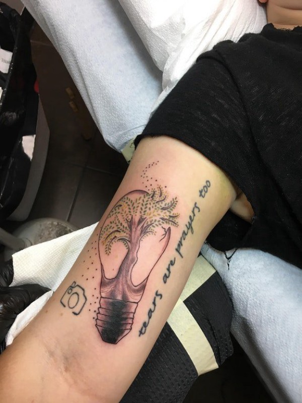 男生手臂上彩绘简单线条灯泡和植物大树纹身图片