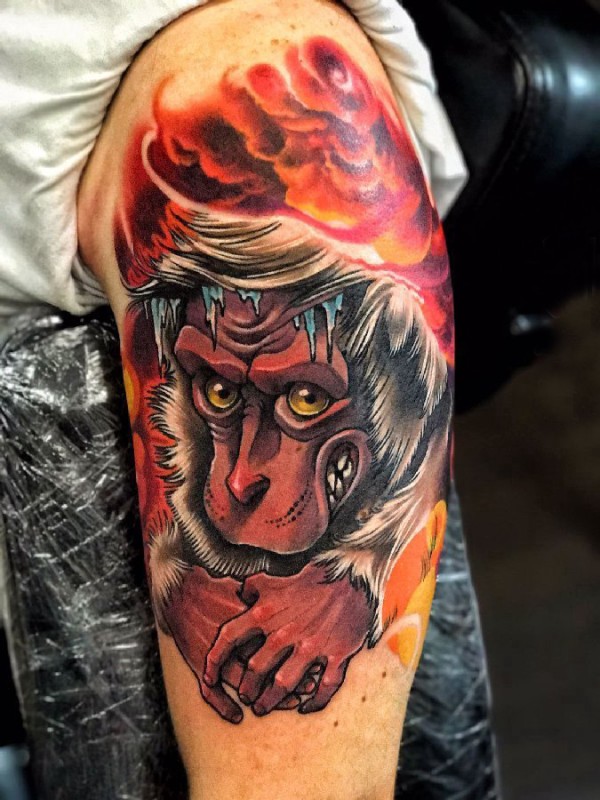 男生手臂上彩绘抽象线条云朵和动物猴子纹身图片