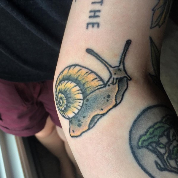 男生手臂上彩绘抽象线条小动物蜗牛纹身图片