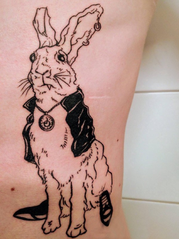 男生侧腰上黑色抽象线条小动物兔子纹身图片