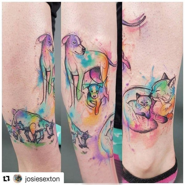 女生小腿上彩绘泼墨简单线条小动物纹身图片