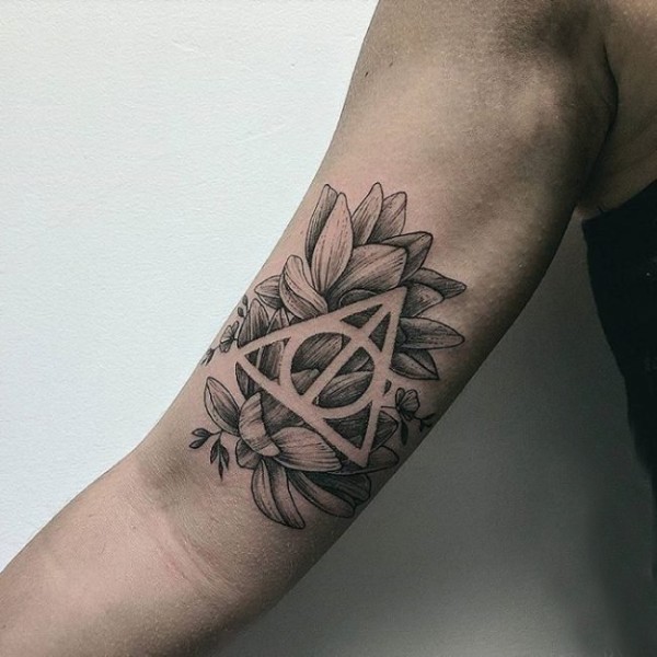 女生手臂上黑灰素描点刺技巧几何元素唯美花朵纹身图片