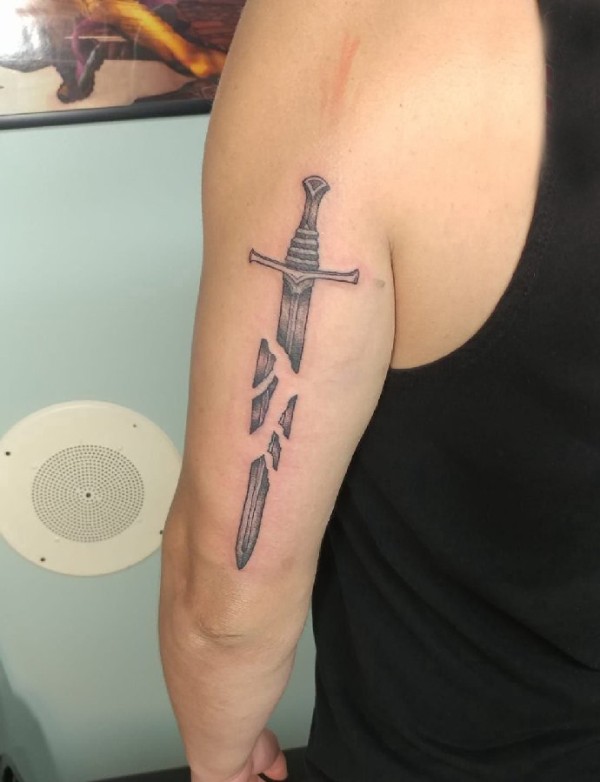 男生手臂上黑灰点刺简单线条匕首纹身图片