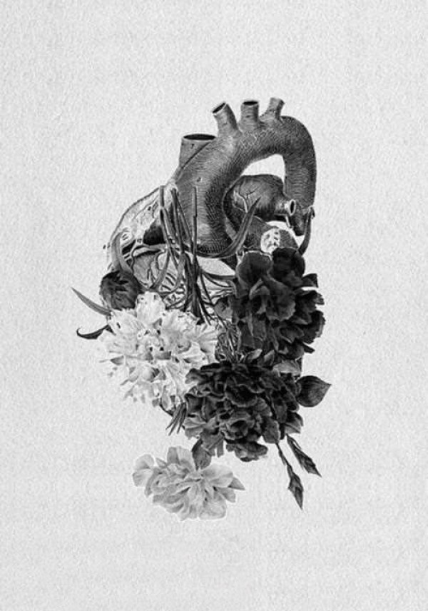 个性的黑色点刺创意植物花朵和心脏纹身手稿