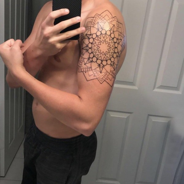男生手臂上黑色几何圆形简单线条创意纹身图片