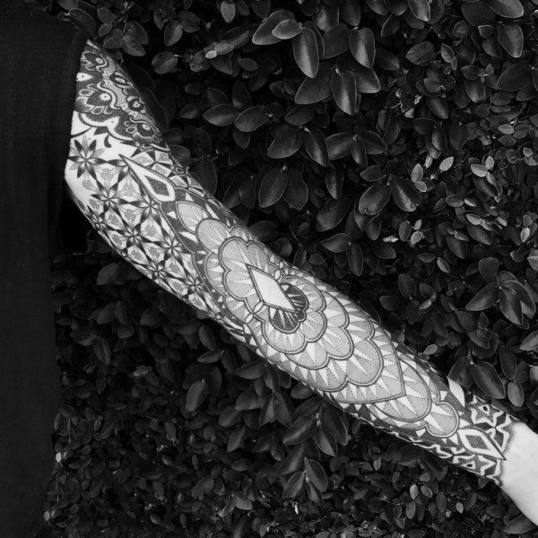 女生手臂上黑灰素描几何元素创意花纹唯美花臂纹身图片