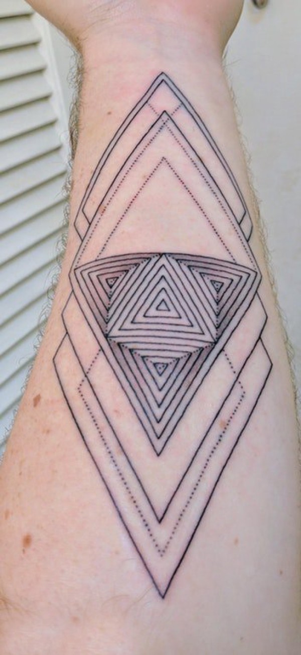 男生手臂上黑色几何线条三角形和菱形纹身图片