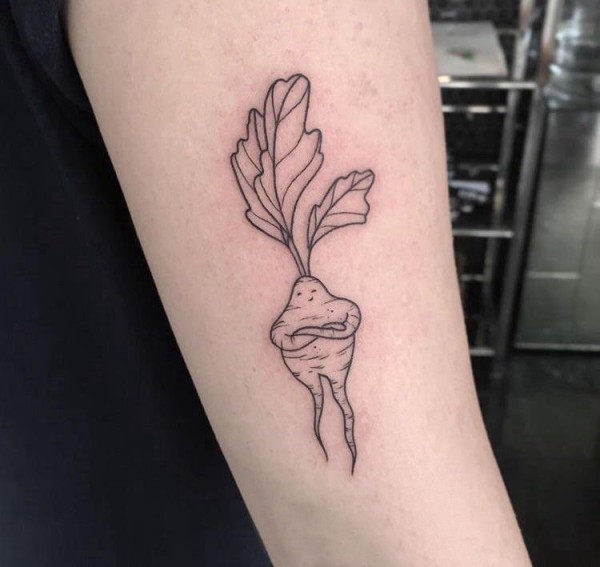 女生手臂上黑色简单线条植物叶子萝卜纹身图片