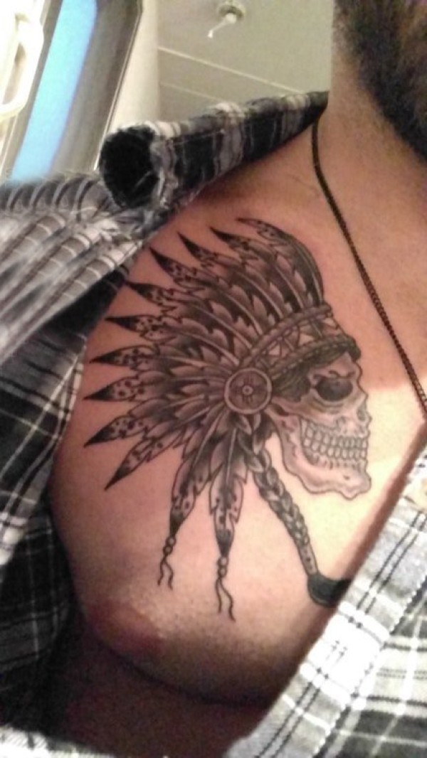 男生胸部黑灰点刺印第安头饰和骷髅纹身图片