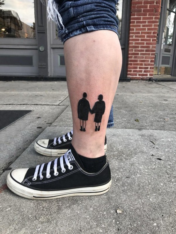 男生小腿上黑色人物轮廓朋友纹身图片