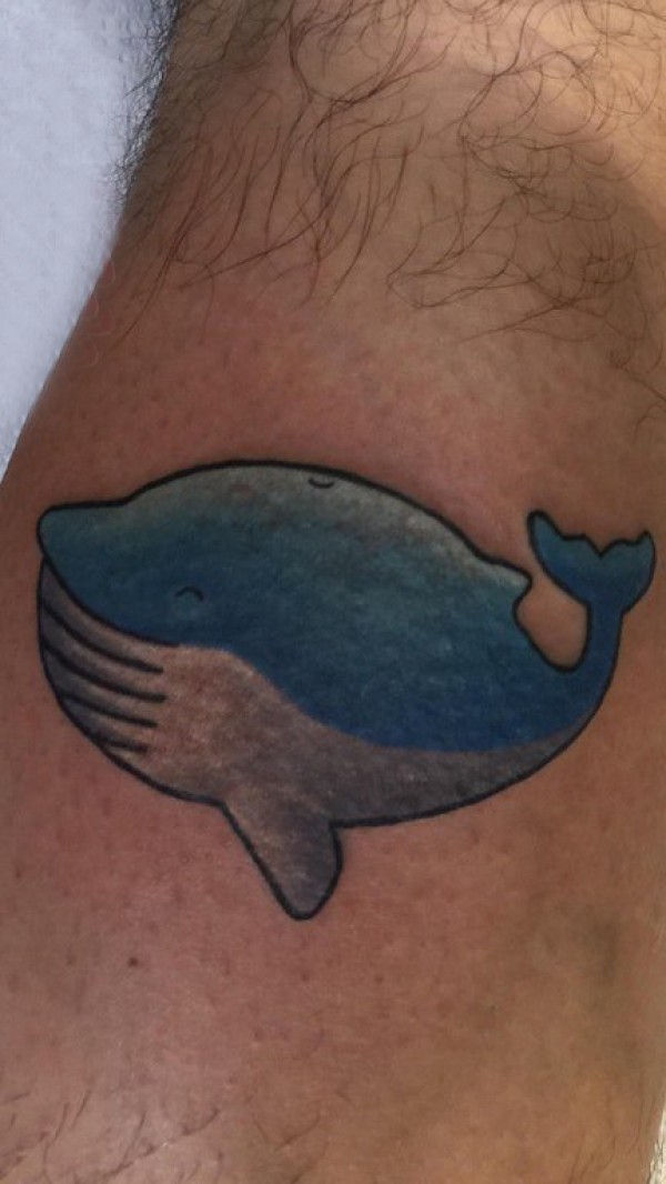 男生小腿上彩绘简单线条小动物卡通鲸鱼纹身图片