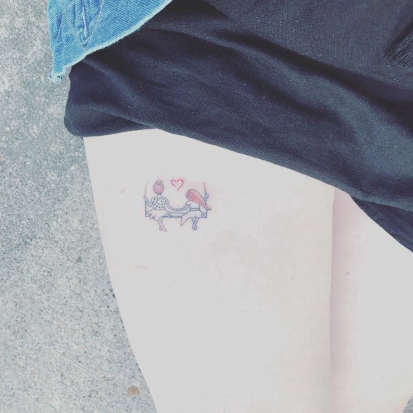 女生大腿上彩绘简单线条卡通人物纹身图片