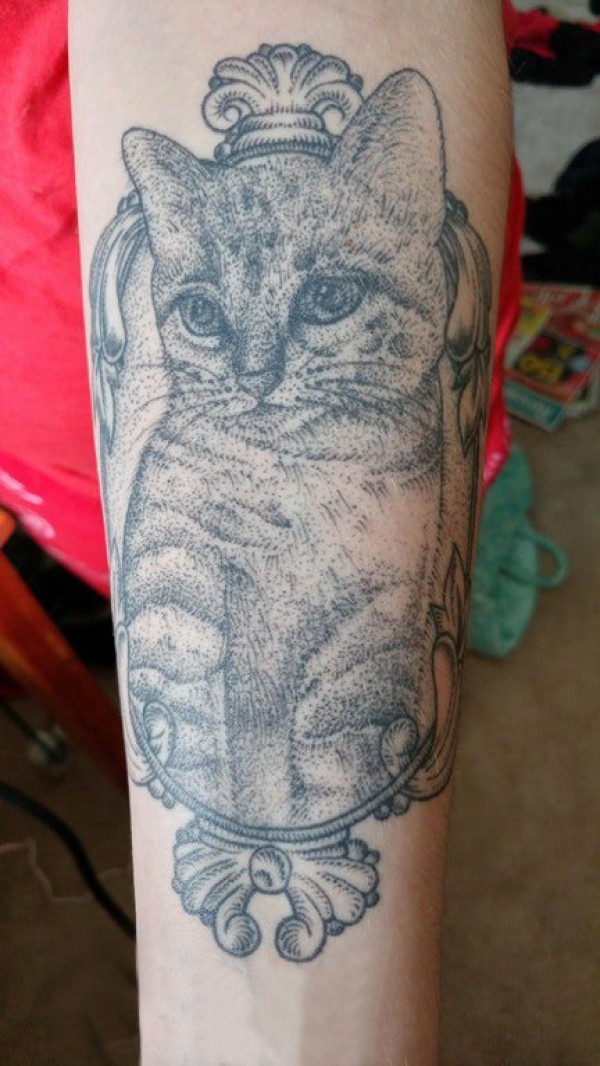 男生手臂上黑灰素描创意可爱俏皮猫咪纹身图片