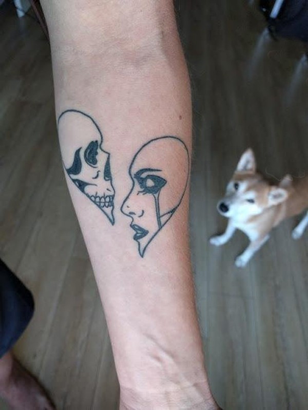 男生手臂上和黑色线条创意心形骷髅纹身图片