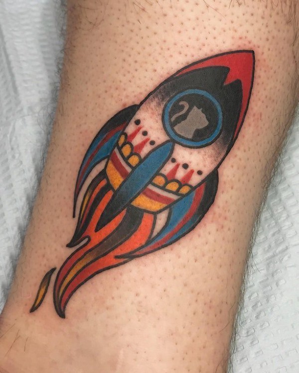 男生手臂上彩绘水彩素描创意火箭纹身图片