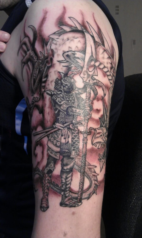 男生喜爱的霸气动物武士和龙纹身图案