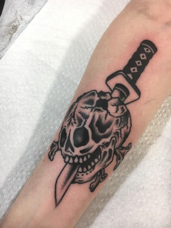 男生手臂上黑灰素描创意匕首和骷髅纹身图片