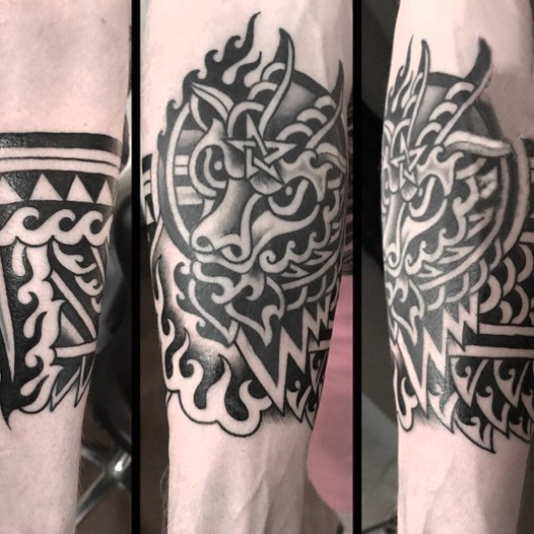 男生手臂上黑灰素描创意龙图腾霸气纹身图片