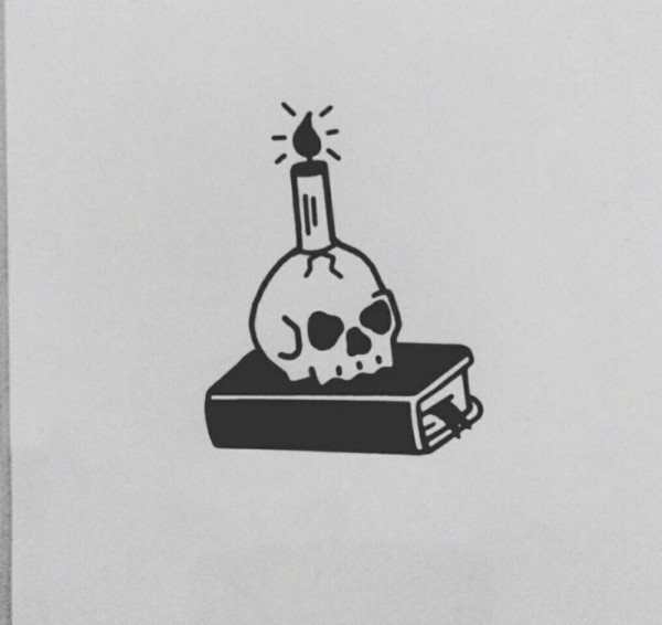 黑灰素描描绘的创意骷髅和蜡烛纹身手稿