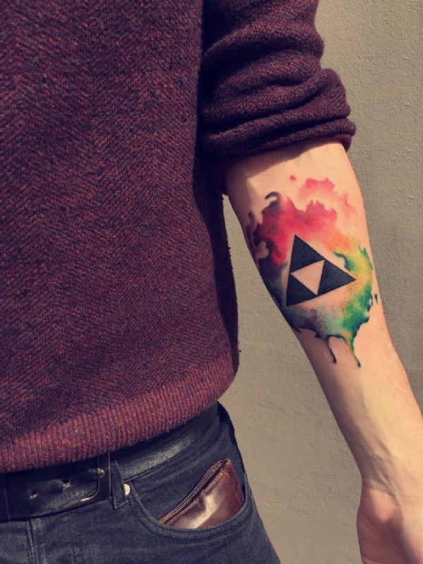 男生手臂上彩绘泼墨几何元素三角形纹身图片
