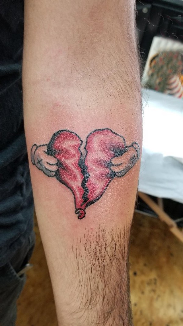 男生手臂上彩绘渐变简单线条撕裂心形纹身图片