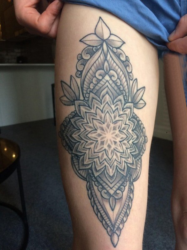 女生大腿上黑灰素描几何元素创意梵花花纹纹身图片