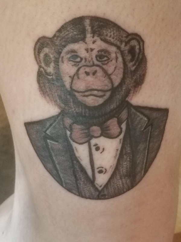 男生小腿上黑色点刺几何线条小动物猴子纹身图片