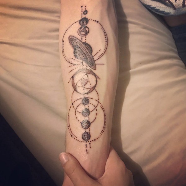 男生手臂上黑灰素描创意文艺星球元素纹身图片